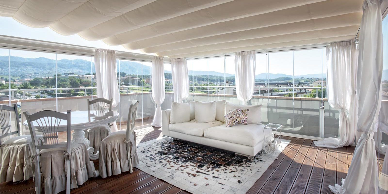Pratiche, resistenti, invisibili, le vetrate per portico si aprono e si chiudono scivolando in silenzio. Solo il senso di accoglienza e di protezione ti ricorderà della parete trasparente tra te e il panorama.
